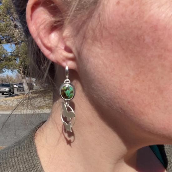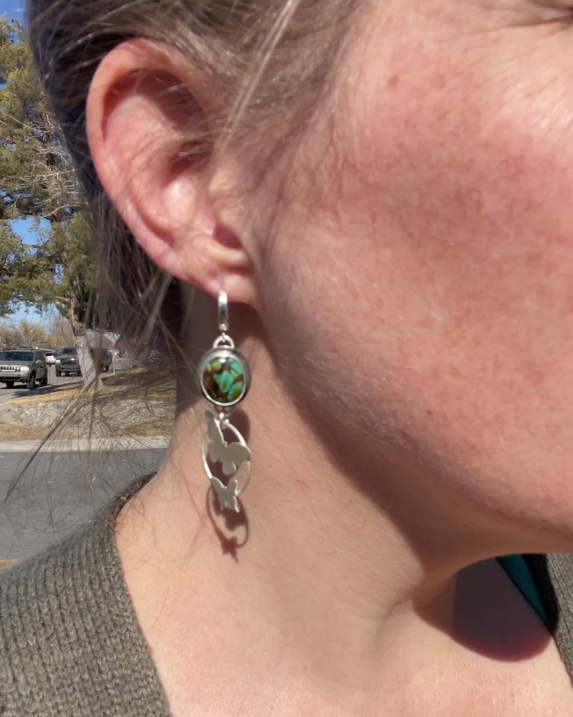 These earrings feature natural Qingu Turquoise set in sterling silver, accented with delicate butterfly details that symbolize transformation and movement. Designed on a comfortable huggy-style hoop, they sit close to the ear while gently swaying with you. A piece meant for everyday wear, carrying a touch of magic, intention, and quiet beauty.