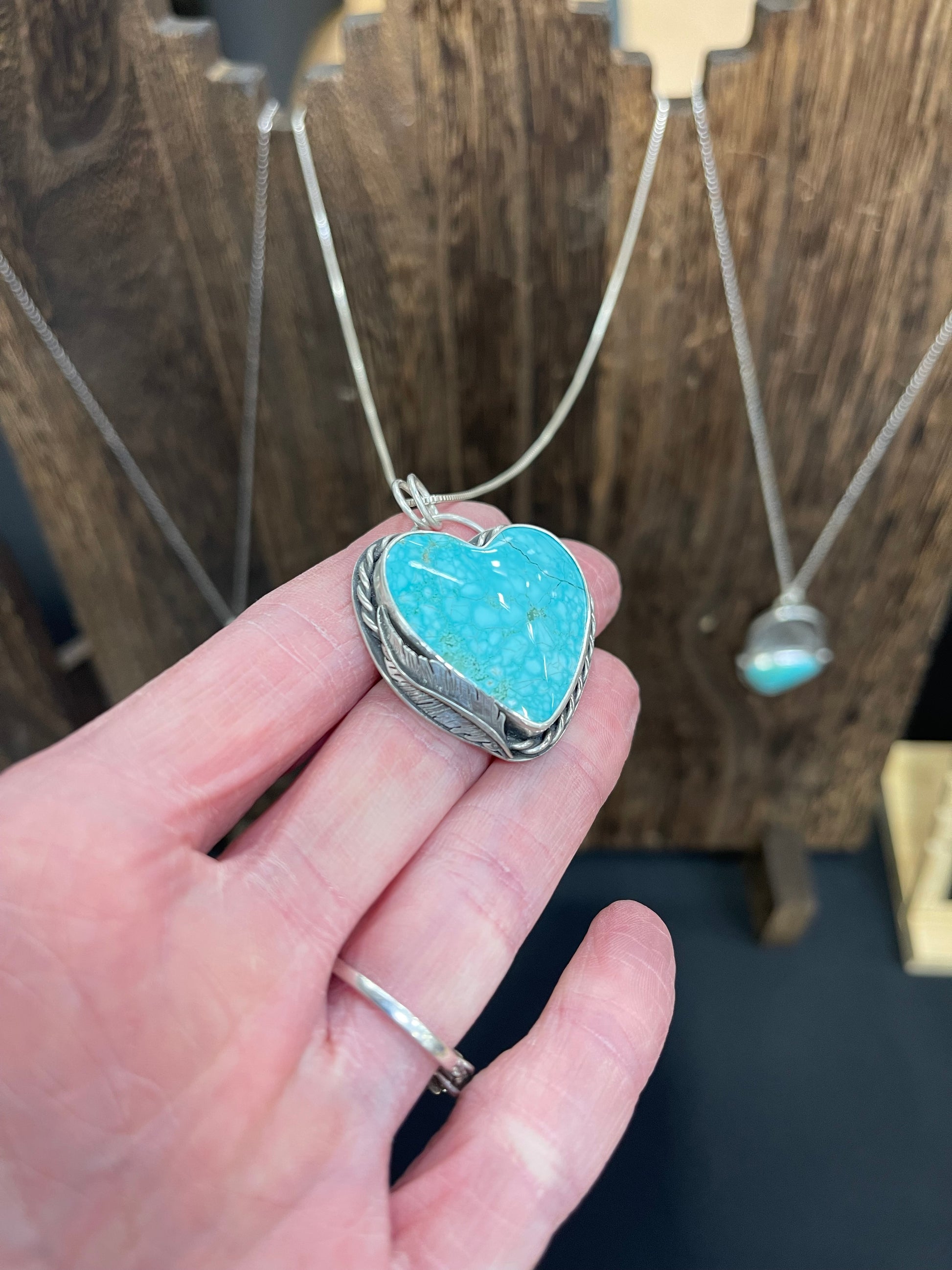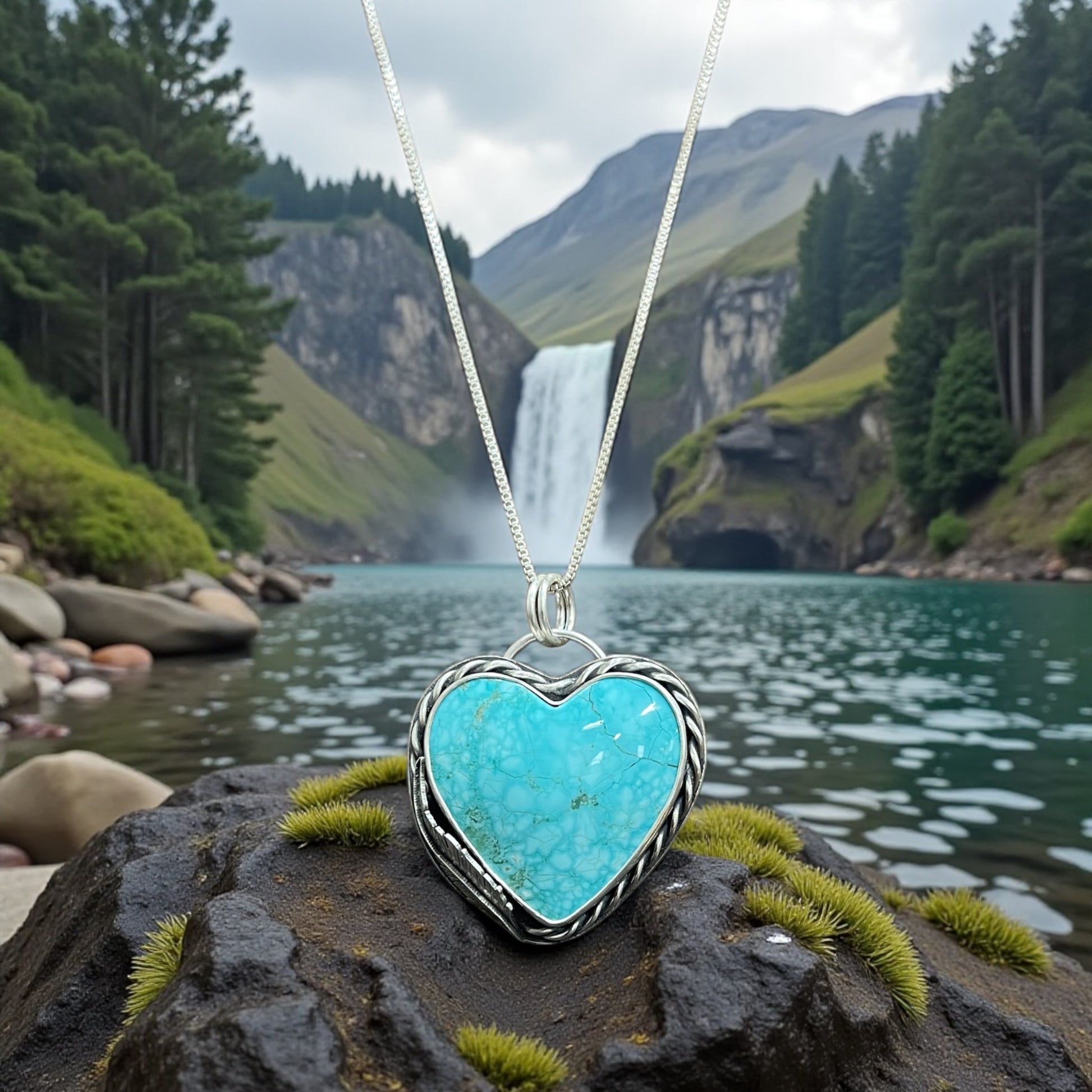 Born of mist, stone, and northern waters, Bláhjarta—meaning “Blue Heart”—is a turquoise talisman inspired by Iceland’s ancient landscapes. Wrapped in sterling silver and adorned with a protective feather, this piece carries the spirit of glaciers, waterfalls, and old-world lore. A timeless heart for those drawn to the quiet magic of the North.