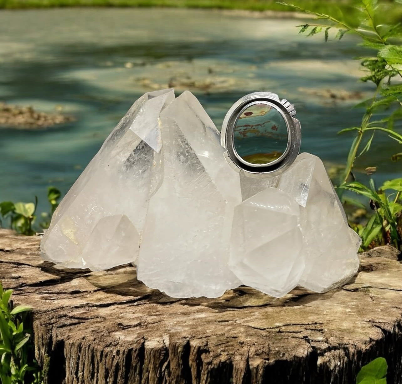 This stunning Gary Green Jasper is set in sterling silver, has a neat triangle wire design, and a wide feather ring band. The blues and greens are so pretty and reminds me of a marsh.