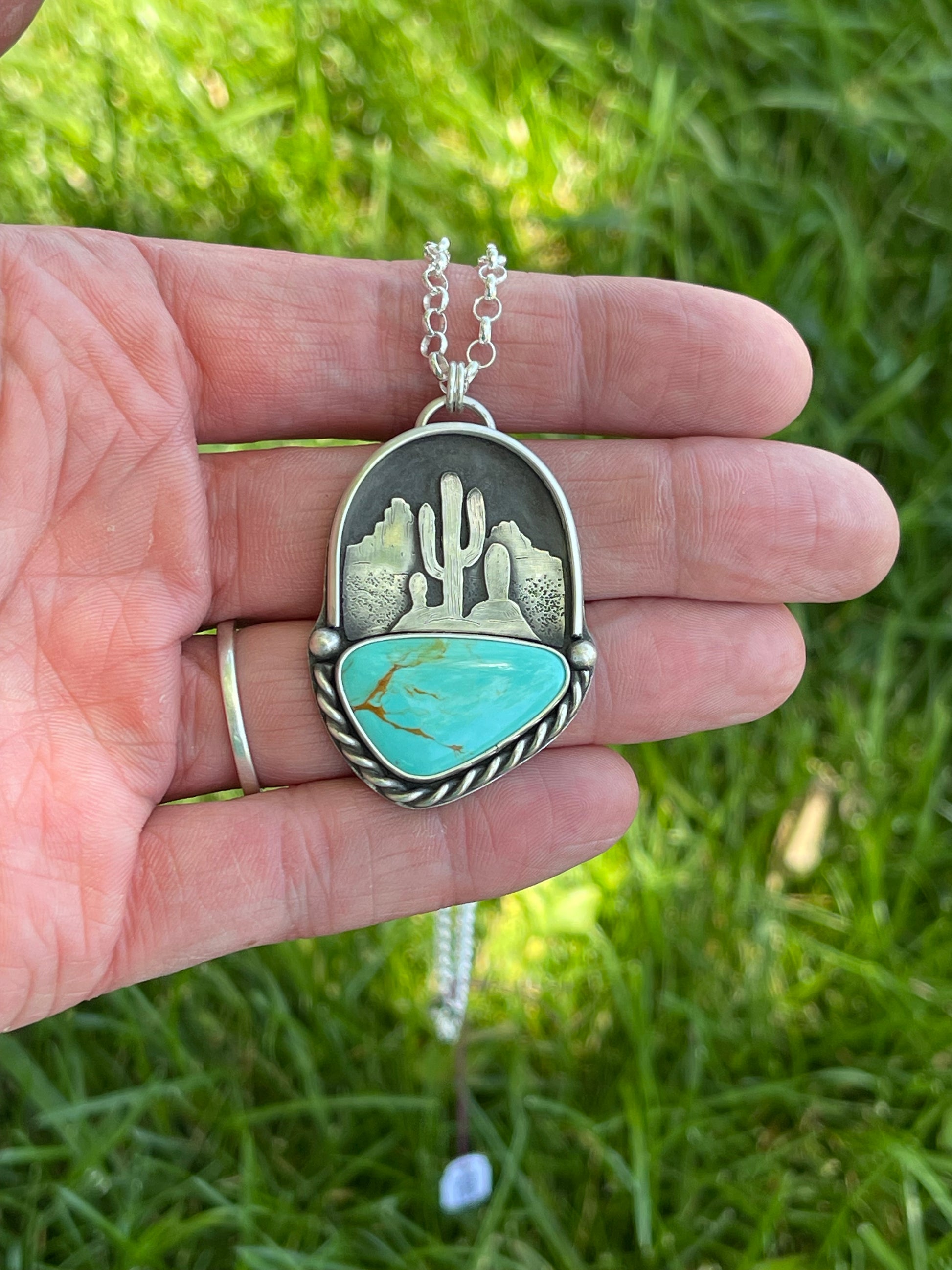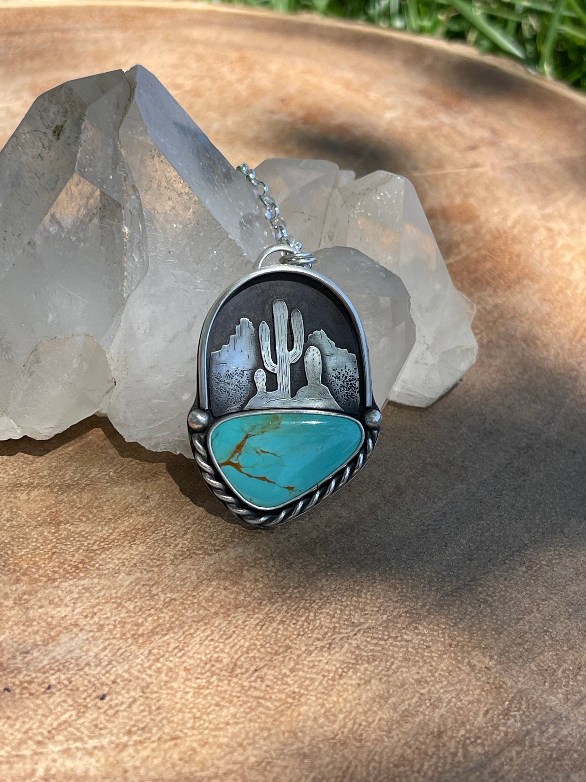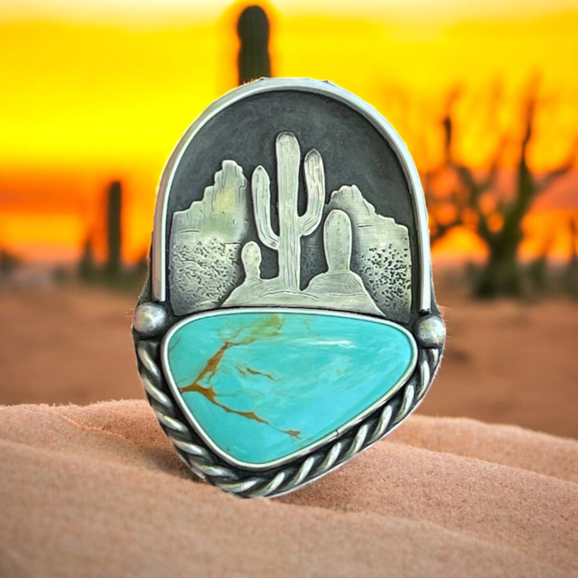 This gorgeous Turquoise is paired with a beautiful  mountain desert scene. The twisted wire and textured silver are just breathtaking.