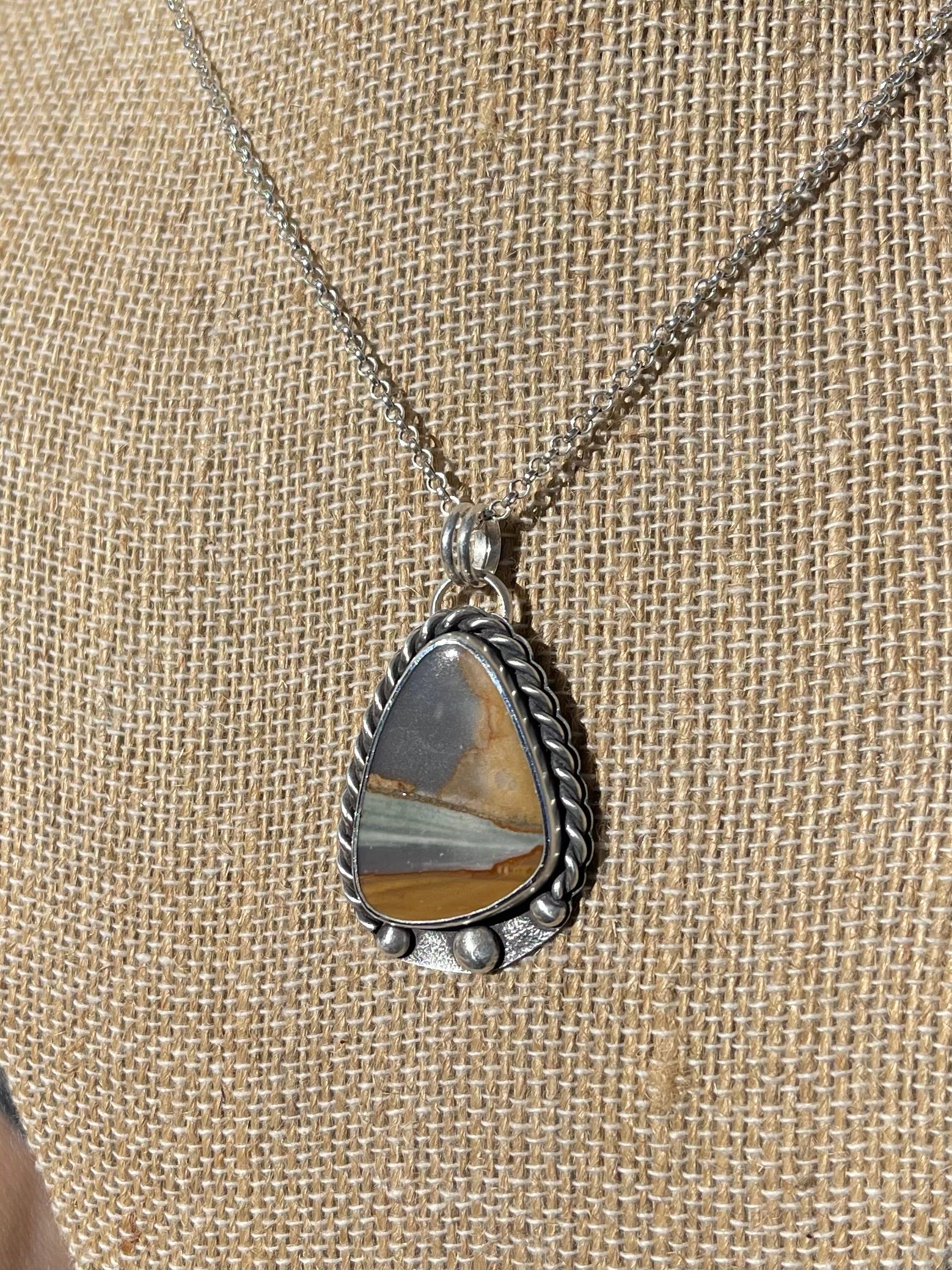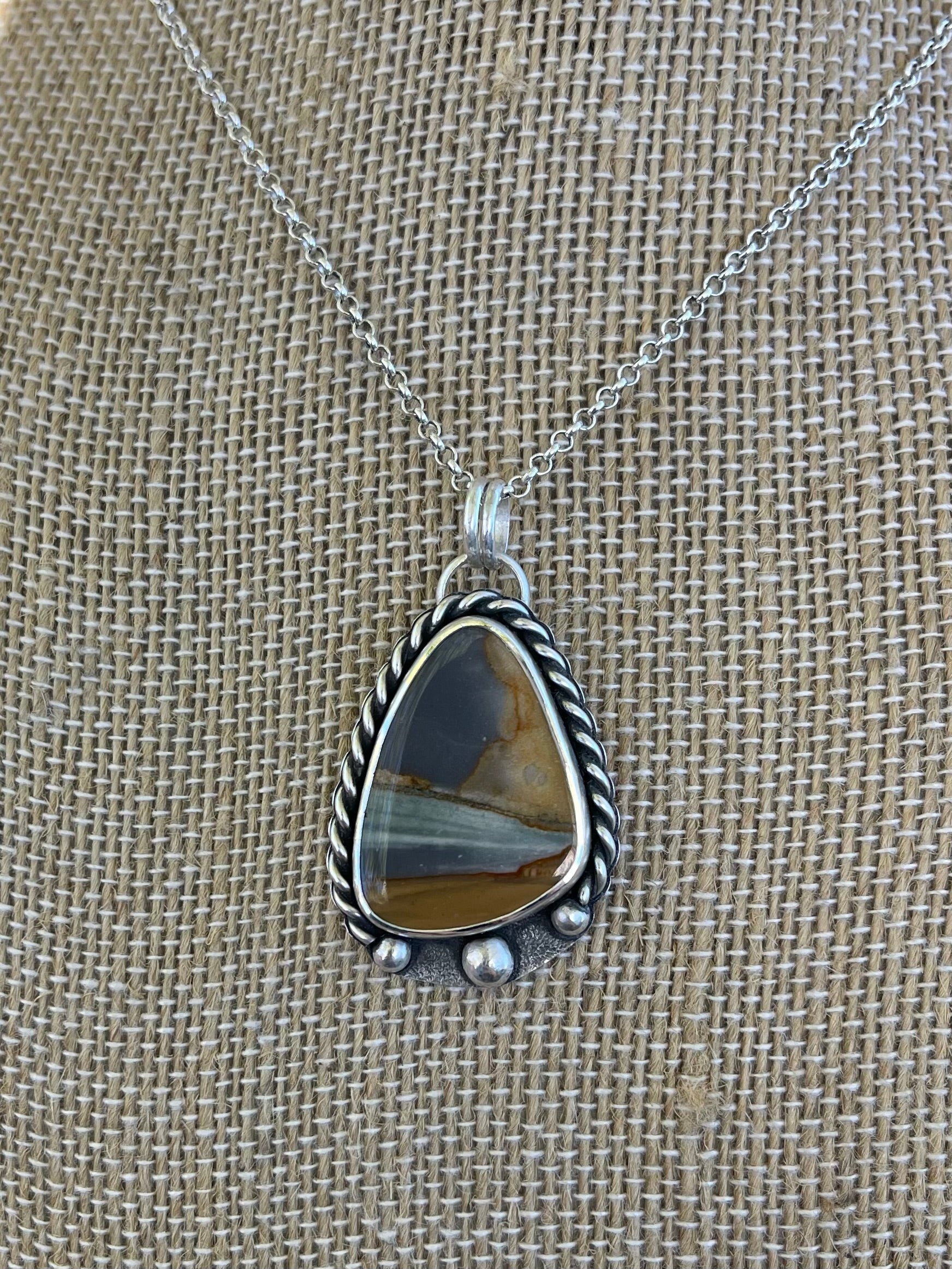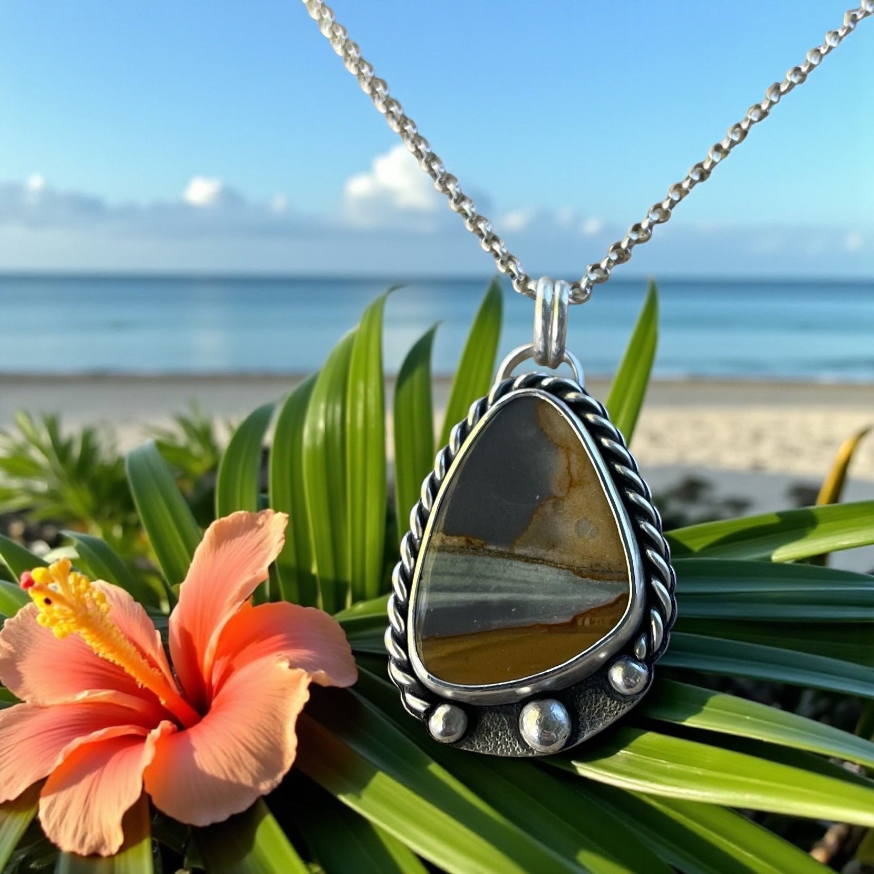 Cradled in sterling silver, this Polychrome Jasper pendant feels like a little piece of coastal magic. Within the stone, an ocean scene unfolds — waves kissed by golden shores — while the textured backplate carries the memory of soft, sunlit sand.