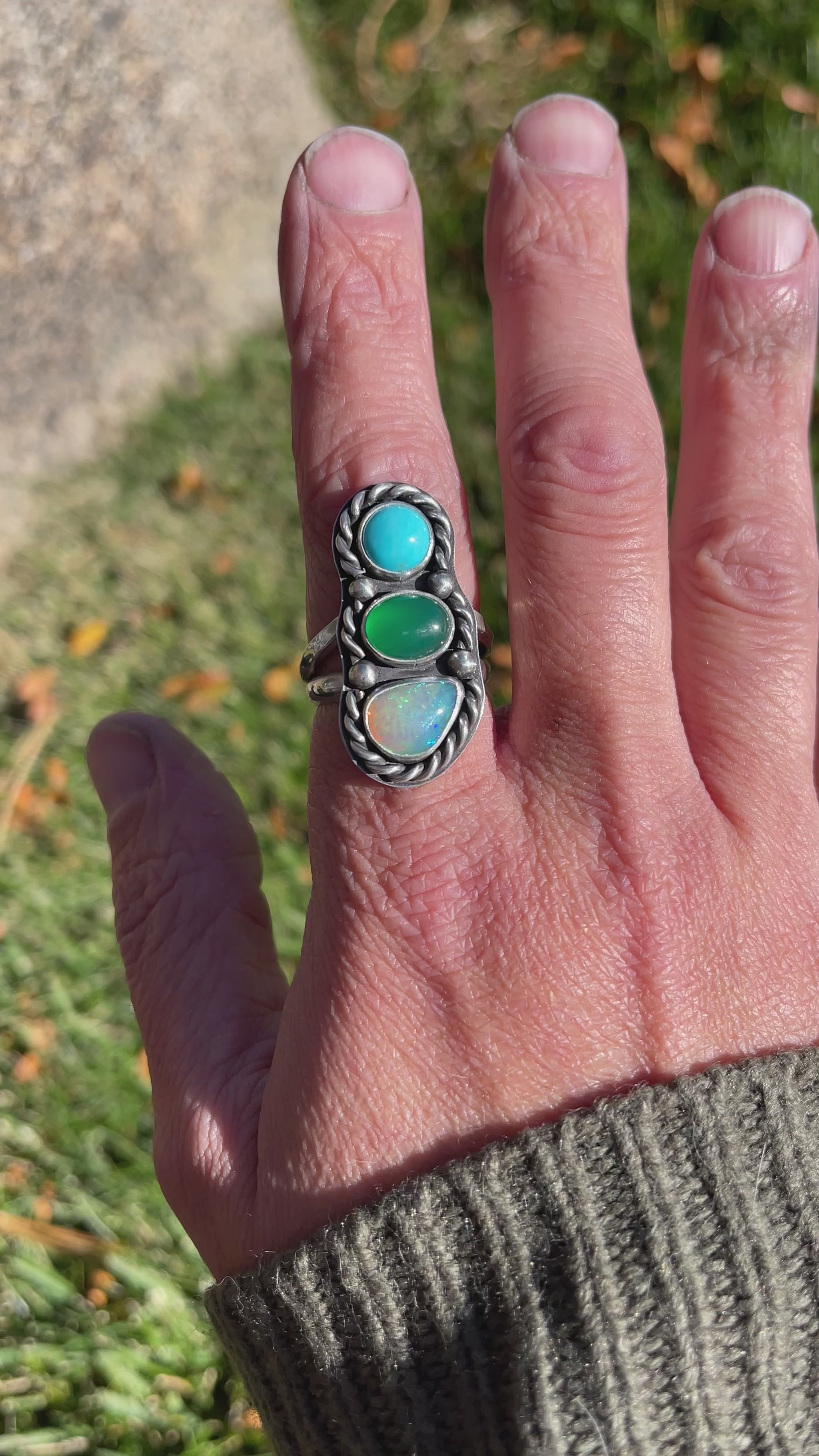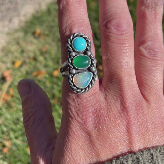 Crafted with Sleeping Beauty Turquoise, Chalcedony, and a luminous Welo Opal, this sterling silver ring captures the essence of the sea. Each stone reflects a piece of ocean magic — calm turquoise waters, deep sea greens, and opalescent waves of light. A bold, nature-inspired statement for the ocean-loving soul.