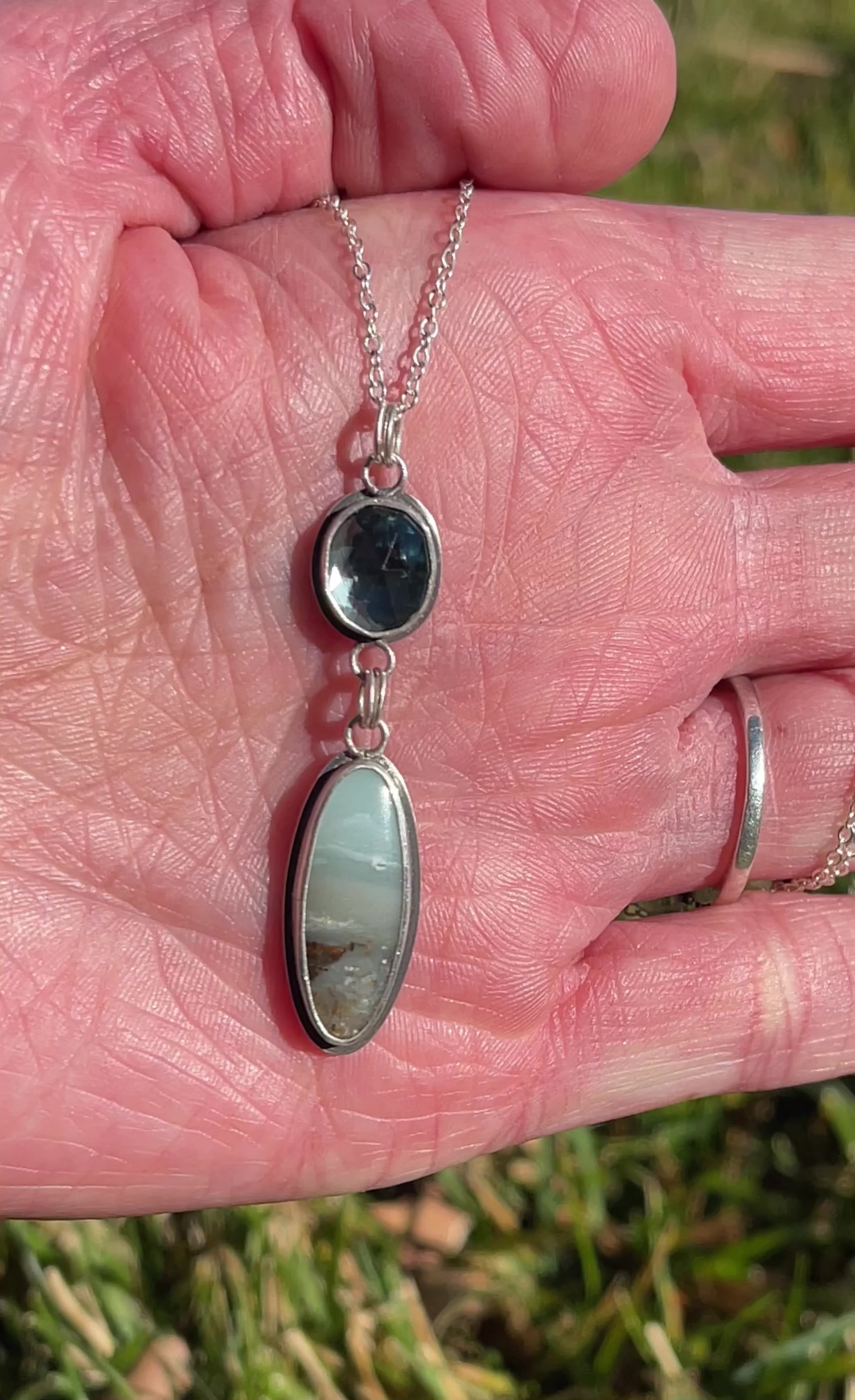 Set in sterling silver and is on an 18” chain.
