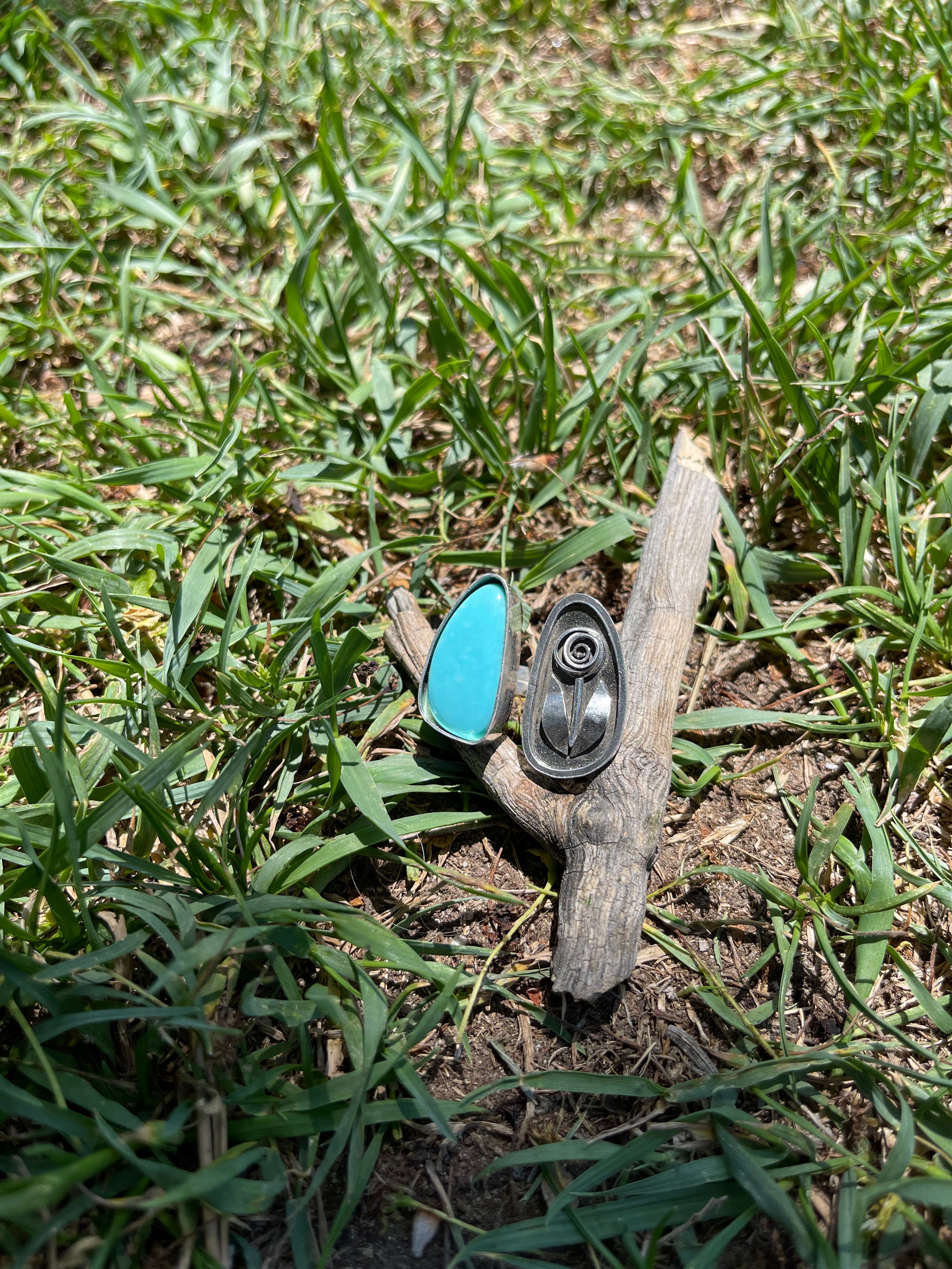 This was the first Shadowbox ring I made and I am so happy with the way it turned out. The turquoise stone is just breathtaking and I think it looks perfect paired with a rose. This stone is set in sterling silver and fits a size 8.5-8.75