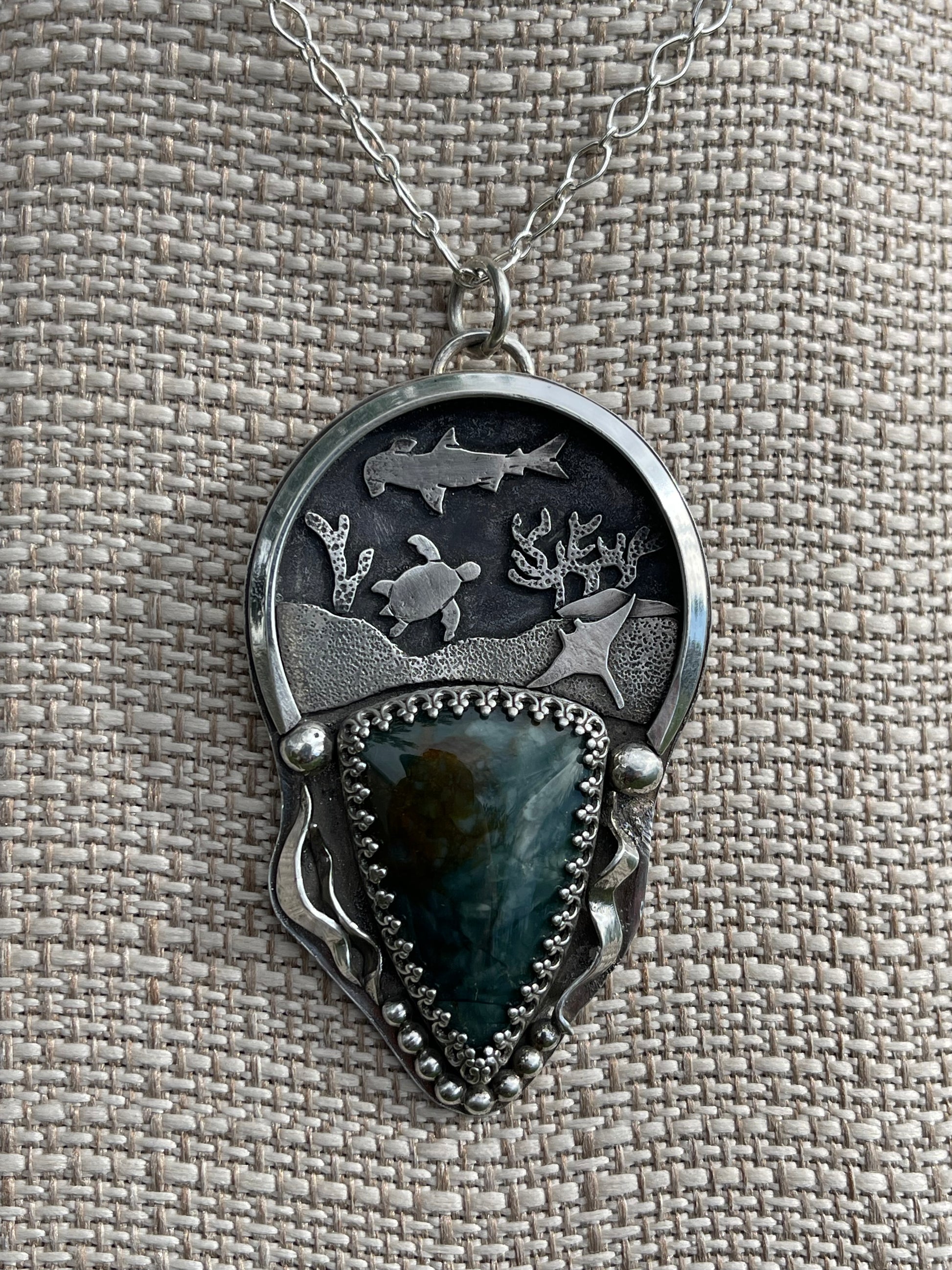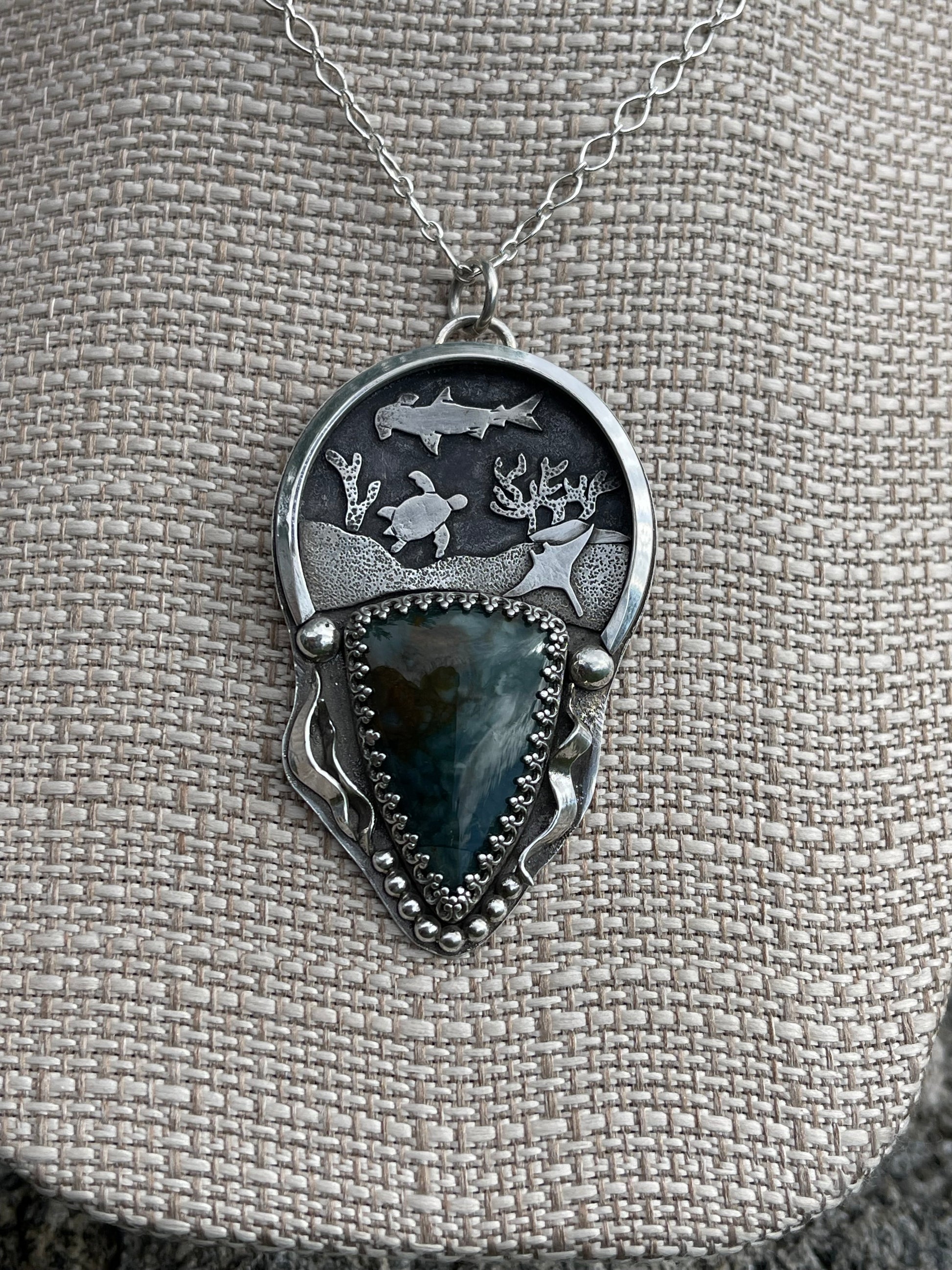 This stunning Morrisonite Jasper goes perfect with this detailed underwater ocean scene. The tiny animals are just the cutest. This beauty is definitely a show stopper.
